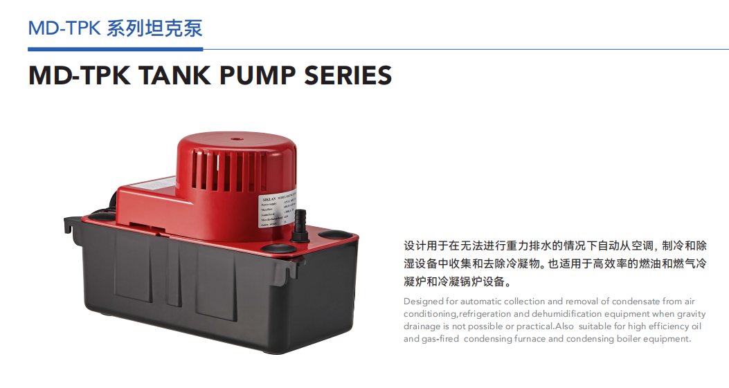 產品簡介:設計用于在無法進行重力排水的情況下自動從空調、制冷和除濕設備中收集和去除冷凝物。也適用于高效率的燃油和燃氣冷凝爐和冷凝鍋爐設備。