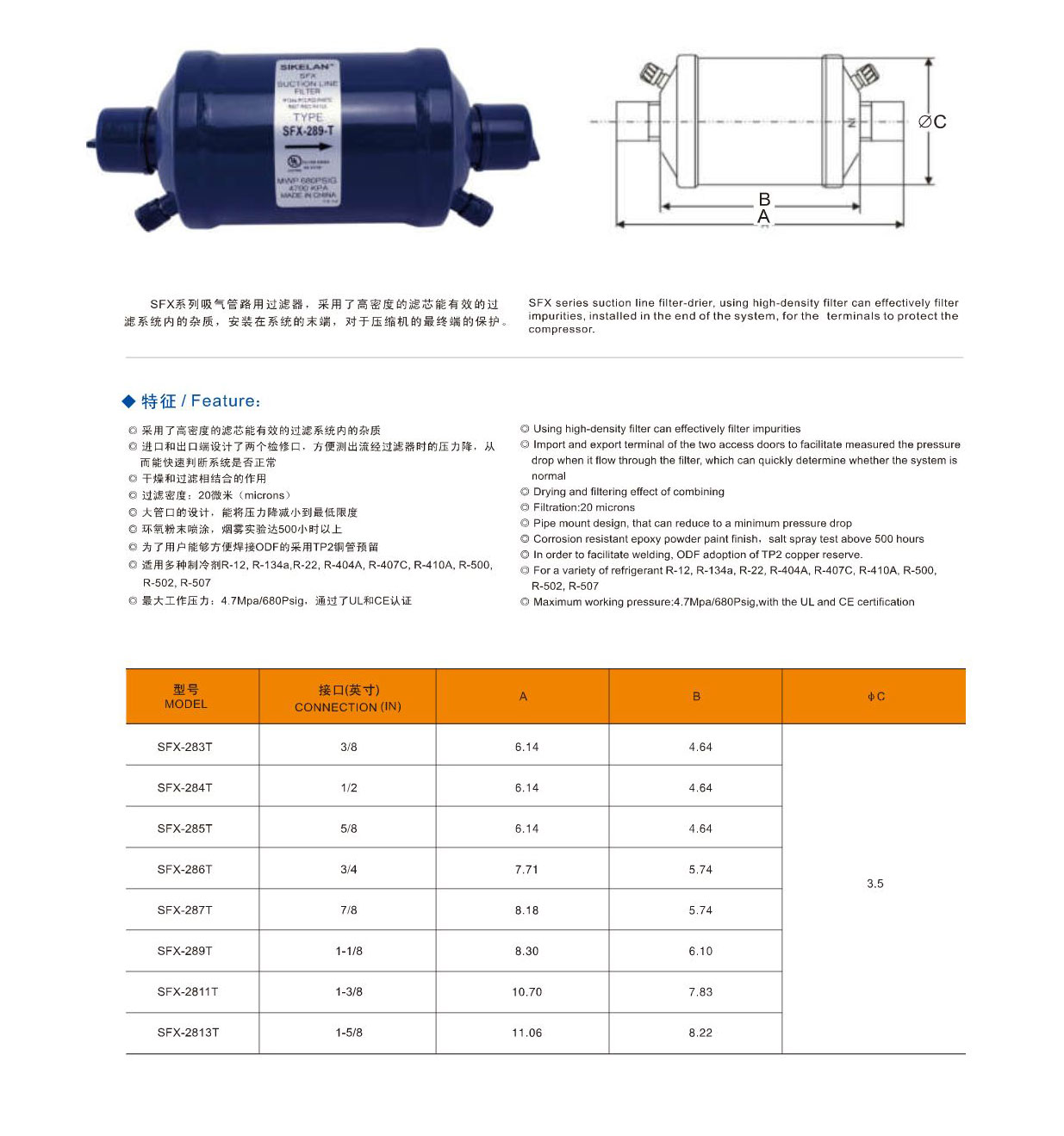 制冷劑按過濾器上箭頭所批示的方向流動時,旁通溢流閥起作用,如果流過元件時產生過大的壓力降,則旁通溢流閥稍微開啟,以保持足夠的氣流并使全封閉壓縮機馬達得到適當的冷卻。