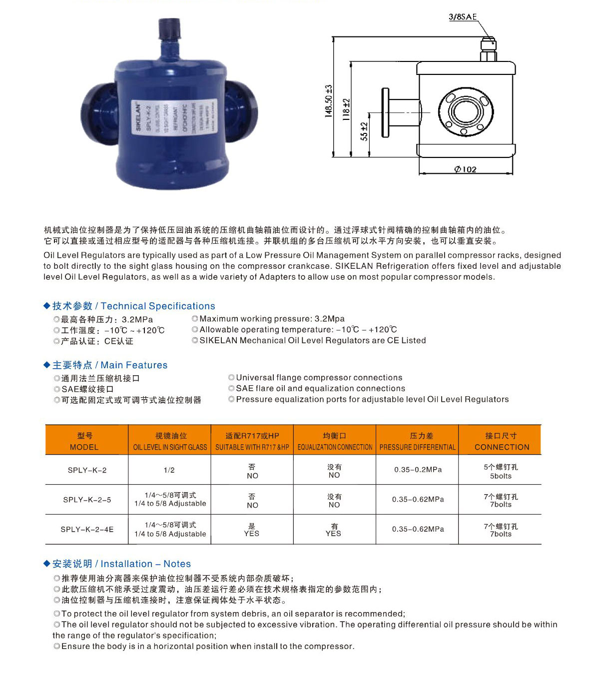 產品簡介: 機械式油位控制器是為了保持低壓回油系統的壓縮機曲軸箱油位而設計的。通過浮球式針閥精確的控制曲軸箱內的油位。它可以直接或通過相應型號的適配器與各種壓縮機連接。并聯機組的多臺壓縮機可以水平方向安裝,也可以垂直安裝。